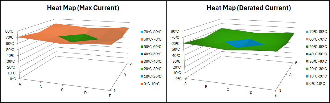 Thermal Derating in LEDs: This heat map demonstrates the temperature distribution across an LED and its heat sink. The graph on the left represents the thermal load at maximum current, showing higher temperatures at the junction. The graph on the right illustrates the effects of derating, where operating the LED at a lower current reduces the thermal load, leading to extended lifespan and more reliable performance.